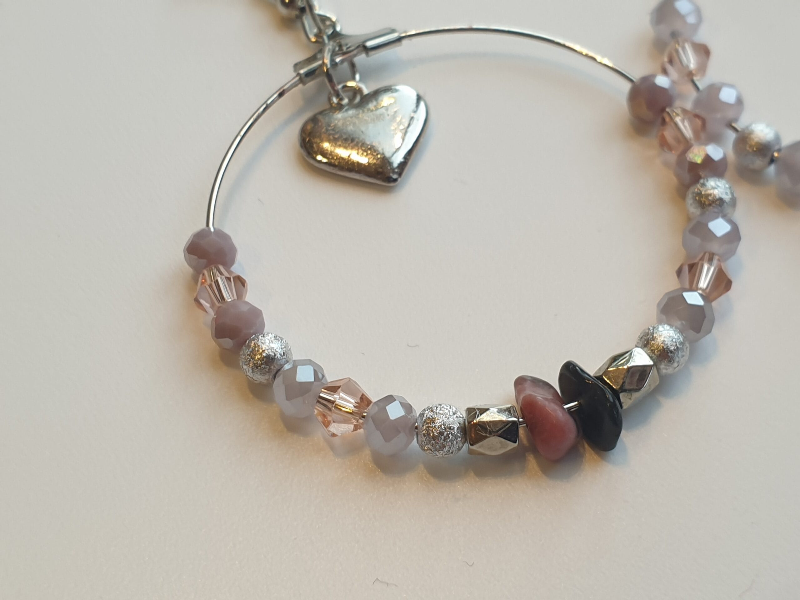 • Kleur: Zilverkleurig, Parelmoer grijze kralen, zilverkleurige kralen, doorzichtige lichtroze glaskralen en zilverkleurige diamantvormige kralen